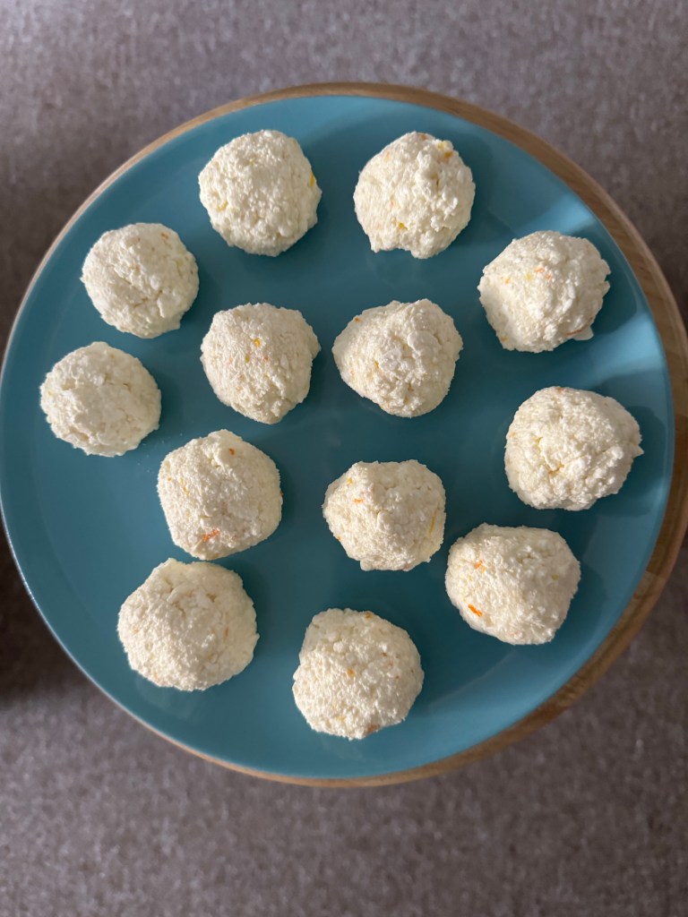 Mash the cottage cheese in a bowl using a fork. Add in the citrus zest, sweetener, and vanilla. Mix well, then roll into little balls with your hands. Thanks to the full-fat cheese, they shape up super easily.