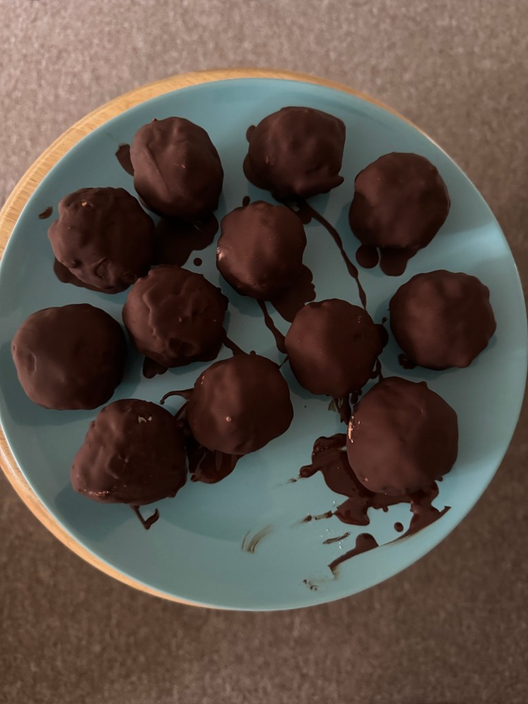 Ezek után feldaraboltam a csokoládét és egy teáskanál kókuszolajjal össze olvasztottam. Nem maradt más hátra mint beleforgatni a golyókat. De mivel kétszer is kellett csokoládét olvasztanom és ez egy elég drága plusz az is, hogy másfél táblát kellett elhasználnom ezért csak 12 golyót sikerült csokoládéba söndörgetni.